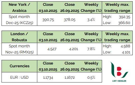 At the terminal markets, the momentum remains firmly upward. The December Arabica contract climbed to 392.35 c/lb, a new two-week high, closing the week up 3.4% at 390.75 c/lb.
